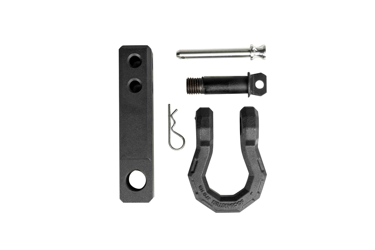 Finished in our signature black textured powder coat, it comes with one corrosion resistant 5/8" pin and R-clip to secure it into the receiver tube. For added security, we recommend using a BulletProof Locking Pin to keep your receiver shackle secured onto your vehicle.